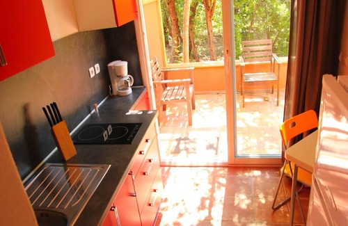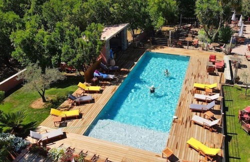 air conditioning, terrace(roofed), garden(shared with other guests), garden furniture, BBQ(charcoal), trampoline, swimming pool(shared with other guests, heated), children's bed, high chair
