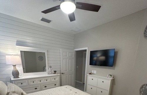 The second bedroom has a queen size bed and is located at the other end of the villa with access to the full bathroom just off the hallway. Also equipped with a smart TV where you may stream using your favorite apps.