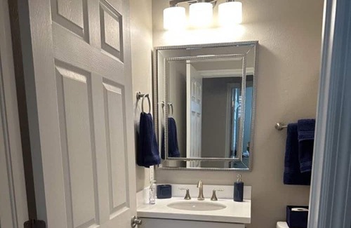 The primary bedroom offers a king size bed with direct access to your ensuite bathroom, which has an oversized walk in shower, dual sinks and water closet. It is also equipped with a smart TV where you may watch TV or stream using your favorite apps.