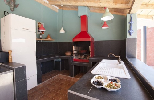 outdoor kitchen, dining table(12 persons), stereo unit, coffee machine(filter), oven(mini), dishwasher, fridge, garden doors, patio, terrace(roofed), garden(private, fenced, landscaped garden, illuminated, 1200 m2), garden furniture, sun loungers, BBQ, parking, swimming pool(private, heated, 13 x 4 m.)