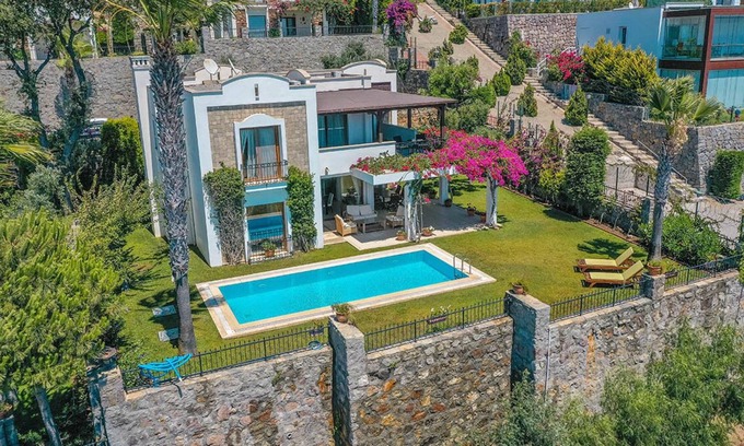 Stunning private holiday villa with private pool and sea views in Kadikalesi, Bodrum Peninsula Turkey. Perfect for groups of couples or large families. Just 300m to local beaches and local shops and restaurants Villa Kastalia is located on a gentle hillside overlooking the Aegean sea and Greek Islands with magnificent open sea and sunset views. You ll experience a fairytale sunset, and after nightfall the lights from the surrounding islands and estates create a mezmerising view. Most importantly, there are fantastic sea views from every room in the house with sunsets to die for! Ground Floor: Villa Kastalias ground floor living space is open plan and spacious with lounge seating area, coffee table, TV etc at one end, internal dining area in the cente and the modern fully-fitted and well equipped kitchen to the left of the dining area. There is access to the pool and garden terrace off this room via sliding patio doors. Stairs to the right of the front door entrance lead to the first floor. First Floor : There are 4 bedooms ( three double bedrooms and a single bedroom) , walk in wardrobe, large livingroom, kitchen, three bathrooms with a jacuzzi and a shower. The master bedroom has an en-suite shower room, bedrooms 2 and 3 share a family shower room. All have A/C units, clothes hanging and drawer space. All rooms have A/C Externally, Momo has a mature private garden, private pool, sunny and shady garden areas and terraces and BBQ area. At first floor level, each bedroom has a private sea-facing balcony and all rooms have sea, pool and garden views. Villa Kastalia is on a corner plot on a quiet internal access road and has private parking area. The complex also offers a large shared swimming pool, tennis court and recreational area to guests. The sea, shops and restaurants are all within 300 metres. The complex has 24 hour security and parking areas. Bodrum is a 30 minute car drive away, 5 minutes to Turgutreis. Electric is paid extra 150TL (approx 30 euro) per week