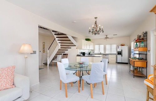 Despite its quaint exterior, Villa La Playa surprises guests with its generous interior dimensions. Discover two inviting living areas—one downstairs and a serene reading nook upstairs—along with a dining table for six and a spacious kitchen, perfect for accommodating multiple cooks. The four bedrooms include a king-sized master, two queen-sized rooms, and one with bunk beds, ensuring ample space for rest and relaxation. Each room, including the well-appointed bathrooms, provides a sense of comfort and tranquility, allowing your group to unwind and recharge in style. This home is perfect for families and friends to relax and enjoy the quieter side of the idyllic island!
