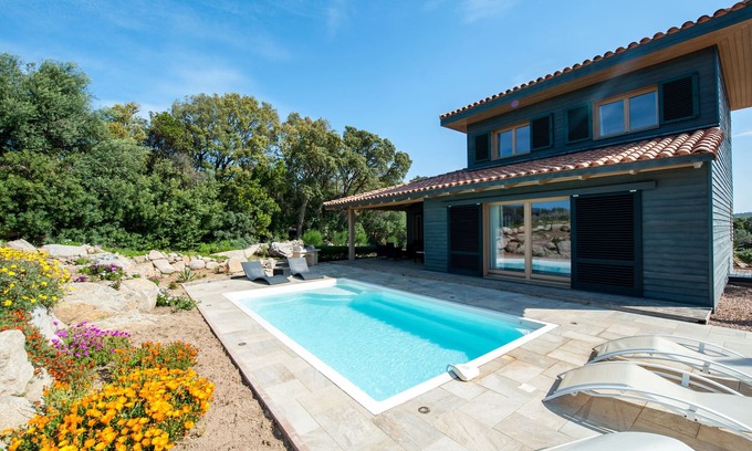 Located in a secure, eco-friendly residence, our air-conditioned private villa is perfect for 4 to 6 guests, just minutes away from the most stunning spots in the region: Porto-Vecchio, Bonifacio, wild beaches, and Corsican mountains.