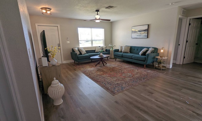 Roll back in time to a Mid Century Modern design. Wake up rested in a peaceful, clean, safe, spacious and stylish home away from home. Master suite with luxury tiled bath. Master suite has modern queen size canopy bed with fandelier and spacious closets. 2nd bedroom has queen size bed with fandelier and roll-a-way bed. 3rd bedroom has queen size bed with twin trundle bed, ceiling fan, smart TV and dedicated work space. Guest bedrooms share a full size luxury tiled bathroom. Fully furnished kitchen with everything you might need for cooking while away from home. Kitchen has GE dish washer and microwave. Help yourself to the complementary coffee bar (Keruig and drip style) Mid Century modern style living room with ceiling fan and 2 large sofa's to relax in comfort while streaming your favorite movie or sporting event on the 55 inch Samsung smart TV. Off the kitchen is an outdoor serene patio seating to sip your morning coffee. Full size Maytag washer and dryer. Single garage. Perfect for working travelers, digital nomads, and larger family Groups. WIFI included. Value priced. We have welcomed many seasons of baseball players for Spring training at Red Sox Jet Blue Stadium and Minnesota Twins baseball stadiums. Ask about discounts for extended stays and returning guests. Accommodates 1-8 people comfortably.