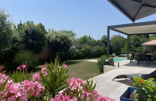 Mas Mayflower offers you a very large, bright living room opening onto a huge terrace protected by a bioclimatic pergola. An adjoining laundry room and a separate toilet complete this ground floor of over 100 m², fully air-conditioned with underfloor heating for optimal comfort. Upstairs, facing south, you will find a master suite with dressing room, bathroom with shower and toilet, two large bedrooms, a bathroom with bathtub, and a separate toilet. Underfloor air conditioning, new 160x200 bedding, provided linens, and ample storage ensure a pleasant stay. At the foot of the terrace, a 7.5 x 3.5 m pool with beach (hydrolysis and PH regulator, chlorine-free) and a tree-lined garden invite you to relax. Hammock under the oaks for naps, deckchairs, and parking available in the house's park or on Chemin des Cabanes. Peace and tranquility guaranteed!