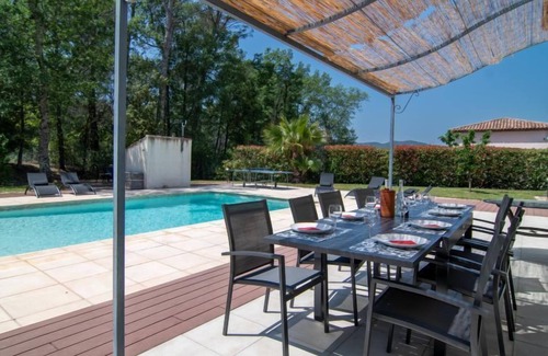 Beautiful single-family house. 4.5 km from the centre of Bagnols en forêt, 13 km from the centre of Fayence, 24 km from the centre of Saint Raphael, in the residential district, 18 km from the sea, 15 km from the lake. Private: property 1'500 m2 (fenced), swimming pool (10 x 5 m, depth 80 - 160 cm, seasonal availability: 01.Jan. - 31.Dec.) with alarm system. Outdoor shower, table tennis, boules, parking (for 2 cars) on the premises. Grocery 1 km, restaurant 4.5 km, bus stop 2.5 km, railway station "Saint Raphael Valescure" 25 km, sandy beach "Fréjus" 18 km. Golf course (18 hole) 8 km. Nearby attractions: Gorges du Blavet. Well-known lakes can easily be reached: Saint Cassien 15 km, Sainte Croix 73 km. The owner does not accept any youth groups. Neighbourhood highly sensitive to noise. Quietness and good behaviour expected.