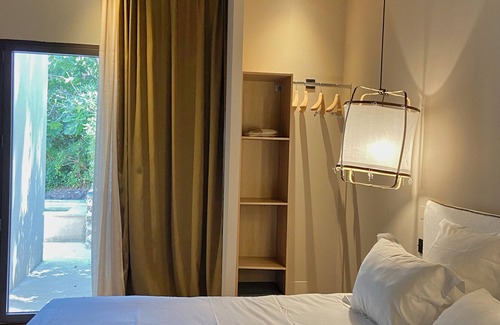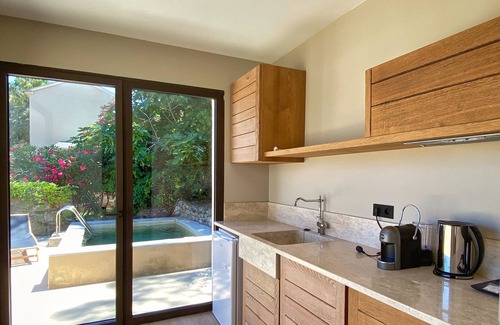 This vacation rental features a safe and air conditioning. Bathroom amenities include a hair dryer, towels, and toilet paper. The kitchenette is equipped with a refrigerator, as well as a coffee maker, an electric kettle, and a microwave.