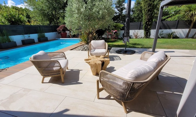 Best-rates for the Sautron house starts from $483 per night with includes Bedding/Linens, Fireplace/Heating, Barbecue/Outdoor Cooking, Internet, Parking, Balcony/Terrace, Security/Safety, Wellness Facilities, Guest Services, Child Friendly, Kitchen, Laundry, Pool StayAndPlay offers fully equipped golf villas, golf hotels, golf resorts, luxury golf cabins, and exclusive golf retreats, making it easier than ever to find your perfect golf escape — ideal for families, peaceful getaways, or pet-friendly retreats with the whole crew.
