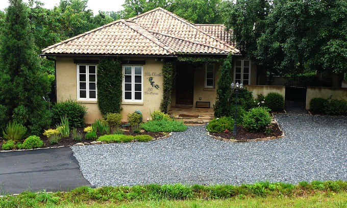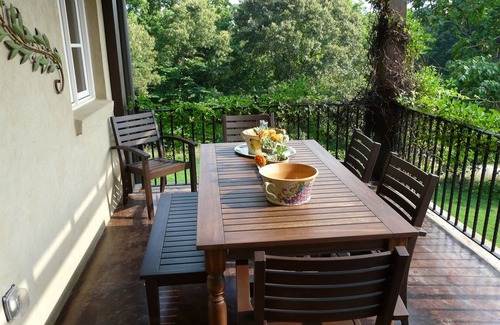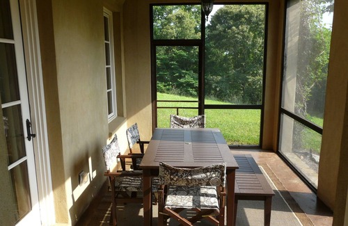 5 Bedroom, 3.5 Bathroom Tuscan Inspired Villa. Spacious open floor plan. Master on main with luxurious King size bed and sumptuous bedding. The master bath features a vintage style claw foot tub to spoil you, separate shower, plus double sinks with granite countertop. Large gourmet kitchen with Kitchen Aid commercial style appliances, separate island with breakfast bar, refrigerator with ice maker, separate wine/beverage fridge, plus Butler's pantry. Kitchen is open to the dining area and adjoining Great Room which features solid wood beams on ceiling. Great room is perfect place to relax in front of the wood burning fireplace or premium 55' flat screen TV. The quaint day bedroom just off the family room on the main floor sleeps two. Additional features include a covered veranda with tongue and groove ceiling, large courtyard and gas fireplace and a screened in veranda on the terrace level. Additionally, there are two bedrooms with King size beds with ensuite bathrooms, a third bedroom with Queen size bed (which shares the bathroom and access with a king ensuite, or can access via screened in patio), and a large laundry room with two sets of washers and dryers. Private, wooded lot yet walking distance to vineyard and only half mile from Le Vigne Restaurant and Winery.