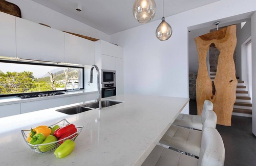This makes Ora Blu unique, as the villa combines luxurious comfort spread over 300 square meters of inside/outside living space with views that are hard to tear yourself away from. From the cosiness of the outside dining area, shaded by a mature pine tree and surrounded by an Iroko deck, or the lounging corners where you’ll relax, to the infinity lap pool with pool ledge, you’ll enjoy breathtaking views as far as reaches the eye. 180° sea views topped off with 180° mountain and nature views!