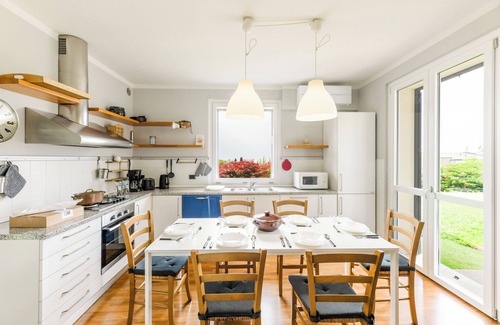 The large, open-plan kitchen is off the main living area. There is a dining table for casual meals and modern, fitted units as well as two more glass doors leading into the garden. The kitchen is equipped with a cooker hob, oven, microwave, dishwasher, fridge, freezer, toaster and coffee machine.