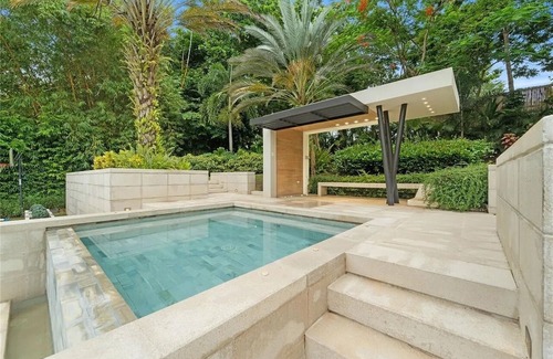 The villa’s courtyard is a private sanctuary—complete with koi pond, fire feature, lounge seating, and a sprawling pool. Whether hosting sunset dinners, lounging by the water, or enjoying the evening glow of tropical lanterns, every moment here feels cinematic.