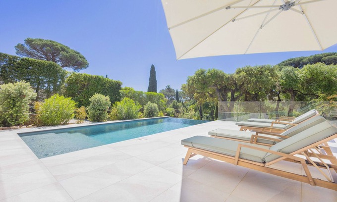 Entirely renovated, this 150 m² villa blends Tropezian elegance and modern lines in a refined style. In the main house, you will find 3 bedrooms, including a dormitory for children, each with its own bathroom, as well as an outbuilding fitted out in a renovated rotunda.