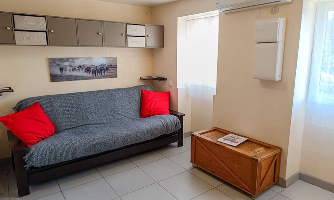 Air-conditioned Studio comfortably equipped (large shower, washing machine, equipped kitchen, high-speed WiFi, smart TV, etc.) on the 1st floor with free parking 50 m away.