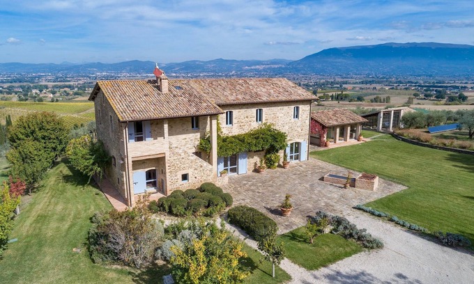 The wonderful classy Villa San Quirico is located in Bettona, an enchanting borgo of Etruscan origin in the centre of the Umbrian Valley. The renovation works, completed in 2005, have given life to a dream location, externally clad in stone, with a breathtaking view towards Assisi. Travertine, antique terracotta and chestnut wood, skilfully adapted to cover the ceilings and floors, are the materials that express the architecture of this luxury property, characterised by a huge elegant living room with fine furnishings, exquisite carpets, numerous decorations of medieval and classical inspiration that animate the walls, and enlivened by arches and large windows facing the garden, creating a magical and fascinating atmosphere. Villa San Quirico consists of the main villa and an annex and is perfect for family reunions, groups of friends or families with children who want to spend their holidays together while, at the same time, protecting their privacy. The bedrooms are comfortable, spacious and tastefully furnished with ensuite bathrooms, and the whole villa is equipped with air conditioning. The pride of this beautiful property, in which the standards of quality and comfort reach a rare excellence, consists of the lush, well-kept garden with an infinite mantle of green grass and colourful flowers everywhere that surround the villa, an outdoor dining area under the portico and the splendid infinity pool, purified with salt and lined with grey stone, with one part heatable, from where you can admire the beautiful surrounding landscape. A fantastic home for those looking for a relaxing holiday in full contact with nature. We are located a few kilometres from Bettona which allows you to move around easily to explore the wonders of the Umbrian and Tuscan territory: typical little towns and villages, with their surrounding walls and picturesque views, and beautiful art cities such as Spoleto, Assisi, Perugia, Todi, Montefalco, Rome and Florence. Services and shops for basic needs are only 3 km away.