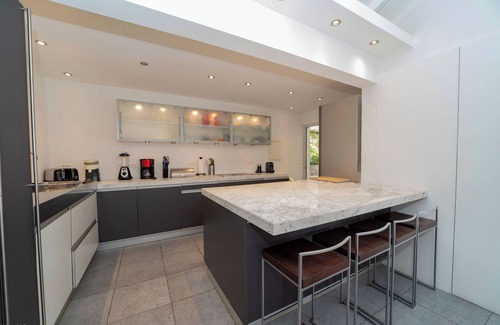 Built over two levels, the villa rental SKRUTTEN offers a fantastic setting, with wide spaces and upscale amenities. The living room is furnished with two sofas and an HDTV in a relaxing atmosphere. The dining room can accommodate eight guests around a magnificent oval-shaped table overlooking both the front terrace with ocean views, and the back terrace with charming vegetation. The modern decor offers a serene atmosphere, with artworks and colorful cushions. In the same space, the kitchen is fully equipped, not to forget the barbecue on the terrace, for delicious meals to be enjoyed with family or friends in the tropical mild air.