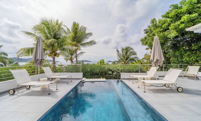 The vacation villa rental SKRUTTEN is a property located on the heights of Pointe-Milou. Spacious and bright, SKRUTTEN consists of four bedrooms and an infinity swimming pool in a lush setting. Its outstanding ocean and sunset views make it the ideal location for an unforgettable getaway in St-Barths for up to eight people.