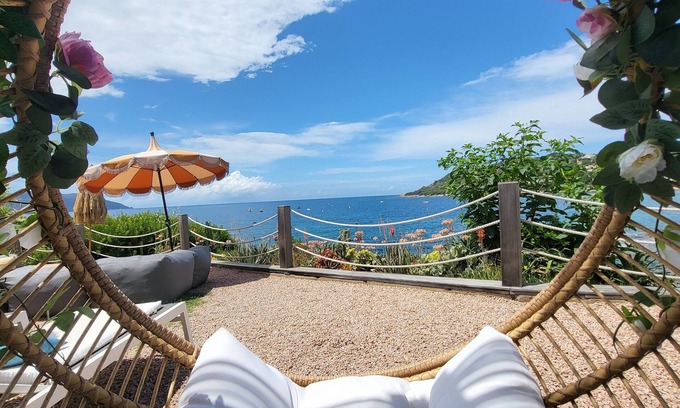 Planned for 6 people and consists of a large living room with a fully equipped kitchen for moments of sharing with ease, a beautiful terrace with breathtaking views of the Gulf. Two bedrooms separated by a bathroom with shower, a master bedroom with dressing room and bathroom with W. C: the little plus bath sea view !!