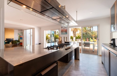 With 8 sumptuously adorned bedrooms, "Summer Wind" is perfect for those seeking family moments and tranquility. The dynamic and colorful interiors of the villa reflect the charm of Mediterranean living. Stepping outside, the vast garden, adorned with numerous palm trees, surrounds a 12x5m pool with an island featuring two palm trees, a summer kitchen, and a jacuzzi – a true relaxation oasis.