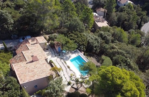 The south-facing terraces and swimming pool (4x9m) offer an exceptional view of the Maures massif and, in the distance on a clear day, the waters of the Gulf of Saint-Tropez.