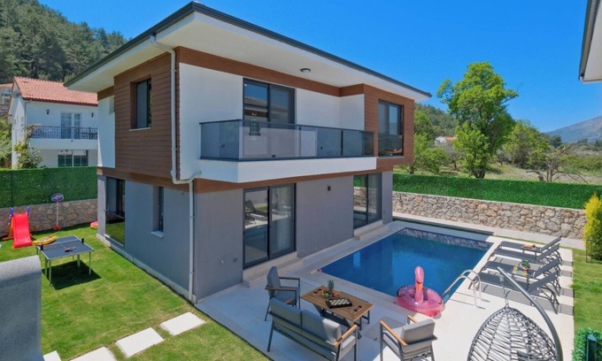 Villa Vitis Duo for rent, located in Yeşilüzümlü village of Fethiye, offers a comfortable and luxurious accommodation experience. Our villa, the construction of which was completed in May 2023, has a total of 3 bedrooms, 1 of which is with a jacuzzi, and has an accommodation capacity of 6 people. It is ideal for large families and groups of friends with its large rooms.