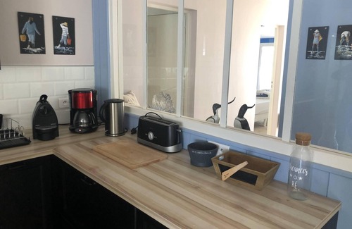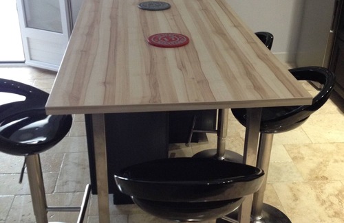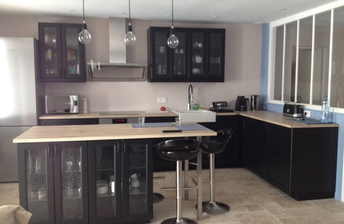 - A very large living room including a fully equipped workshop-style US kitchen with a central island allowing meals to be taken out, opening onto a cozy living room with two comfortable sofas, a coffee table and a large flat screen TV (with box, wifi, speakers for music).