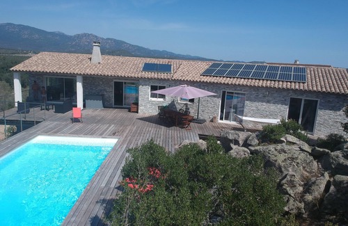 In the middle of a ground of 4000m2 made up of rocks and olive-trees, this villa of 140 m2 habitable, with swimming pool 8x4 integrated in a terrace of 80 m2, profits from a room of 45 m2 with chimney, wifi, 4 picture windows to contemplate the view of the surrounding mountains, and access to the wooden terraces of 80 m2. It has 3 bedrooms with double beds, 2 bathrooms (shower and bath), 2 toilets, 1 large kitchen and a storeroom.