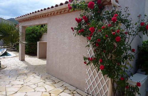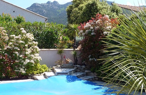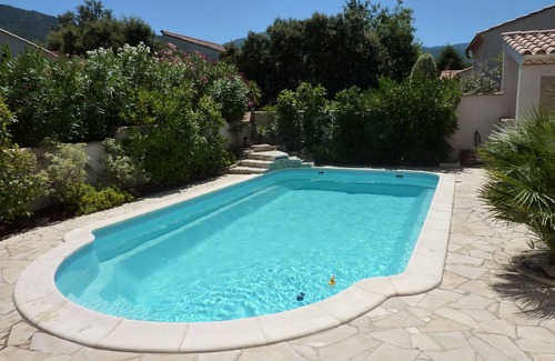 The outside has a large pool 8 m x 4 secured by a fence, with large terraces private garden landscaped. Deckchairs available and garden table with armchairs.