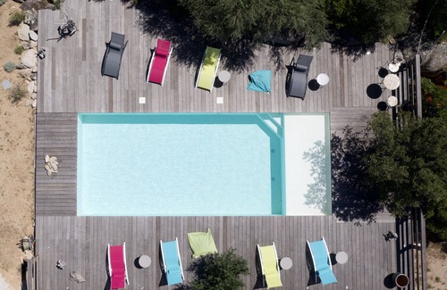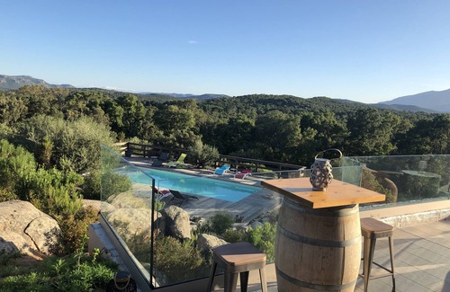 The villa Gliastriccia has a swimming pool at the bottom of the house surrounded by rock. The dining room is spacious and bright. The kitchen with its central island is very convivial. The terrace is huge and allows you to isolate yourself while being very pleasant to live in. Nature is present with its 7000 m2 of surface.