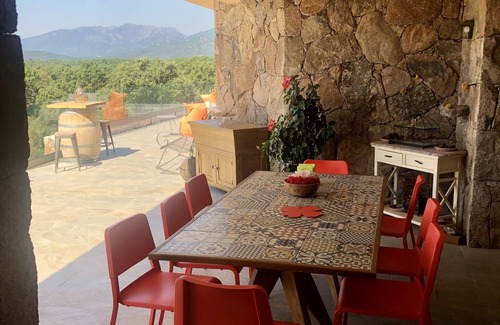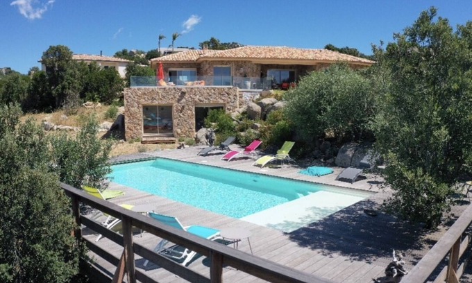 A haven of serenity in the middle of the maquis. Come and enjoy the Dolce Vita in the south of Corsica with this magnificent stone villa nestled in the heart of the maquis, on the heights of Saint-Cyprien beach near Porto Vecchio with breathtaking views.