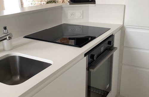 The outdoor area, consisting of a 23 m² courtyard and a very nice high terrace with sea view, is equipped with garden furniture, deckchairs and a barbecue.