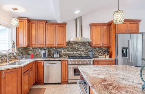The large main living area includes a huge, modern kitchen with a Wolf gas range, a second Electrolux Electric oven, a Bosch dishwasher, two refrigerators (one in the nearby laundry room), an additional wine refrigerator, built-in microwave, and two large sinks.