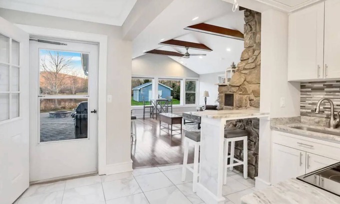 The property includes a scenic pond, two streams (one is a registered trout stream, Mistucky Creek), a waterfall, a private path around the pond with two bridges, mature plantings, abundant wildlife and seasonal mountain views. The water source is Warwick Village’s reservoir system (The Times Herald Record referred to it as one of the cleanest streams in Orange County). There are two patios with seating by the waterfall and a large patio off the kitchen which includes a grill, a dinning area and a firepit to stay warm on cooler nights.