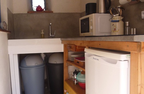 Our caravan, a 1980’s French Esterel, has been tastefully renovated. It’s very bright and airy, has plenty of storage and a dining area with its cute table and seating area for two. With its private patio, kitchen and bathroom, this accommodation for two people is totally independent and ideal for travelers looking for greater comfort than a traditional campsite offers. The kitchen is very well equipped: hob, fridge, microwave, kettle, toaster.