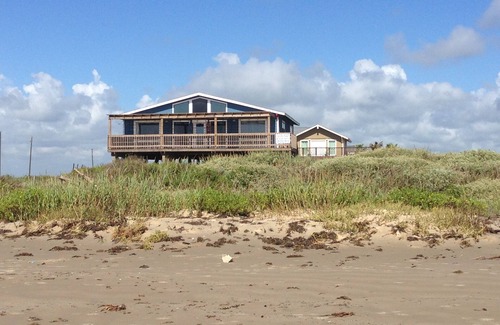 Colorful vintage beach front house rental in Surfside Beach, Texas. Sound Waves is a 3 bedroom, 2 bath vacation rental with beach front views of Surfside Beach from the large deck. Semi-private with no neighbors right next door. It's no longer possible to building a beach house this close to the water. Wonderful cathedral ceilings with open floor plan and walls of windows to enjoy the ocean front views. Sleeps 10.