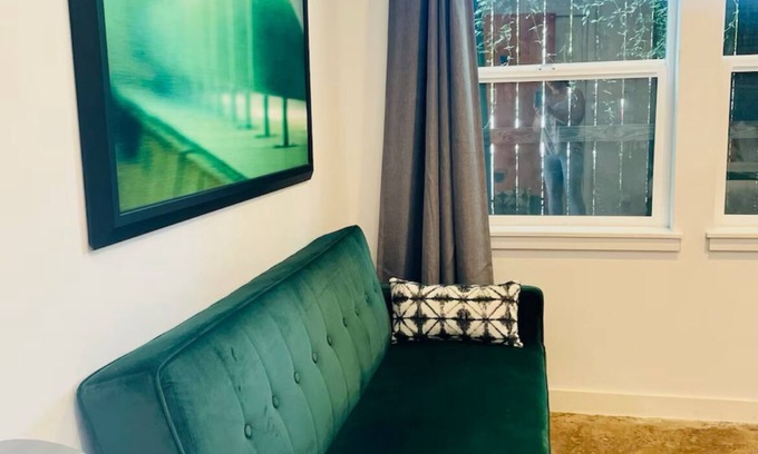 Beautiful Vintage Suite Studio 7 offers modern all amenities you need for a perfect vacation getaway or long term stays, including, WIFI, Smart 50" Roku TV. AC & Heat, Desk, Complimentary Coffee and Snacks, Queen bed, Sleeper Sofa, an adorable petite kitchen, with microwave, refrigerator, as well as dishes and flatware for two. With a stove top, and pots/pans. The bathroom includes towels, hairdryer, and body care essentials.