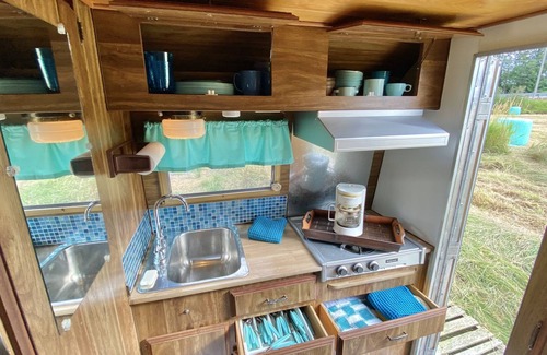 While this darling 1978 vintage trailer is small, the surrounding area feels large, located in the middle of a vast field with open views of the Cascades and Mount Rainier. Fully functional with water, electricity and propane, the kitchen is well stocked with a bed that converts to a dining table.