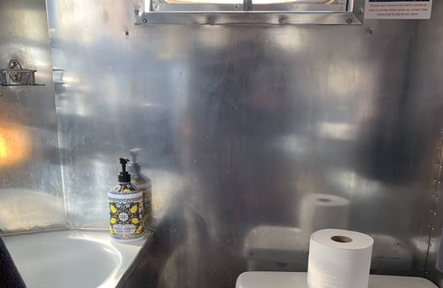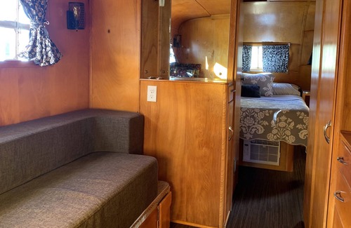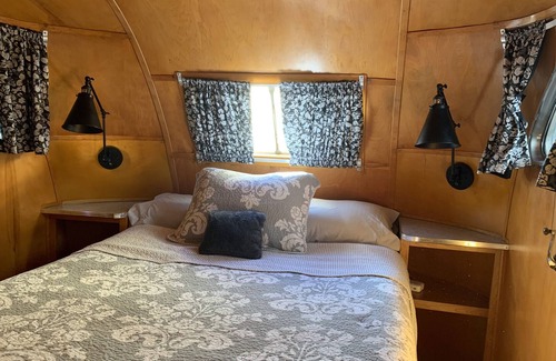 This beautifully restored gem sits under cover next to our newly constructed large metal shop building on our 1.5 acre gated property on the banks of the Rogue River. The cozy birch wood interior lends a warm and peaceful atmosphere, and the many windows take advantage of the beauty of the surrounding area. Included is a fully equiped kitchen with apartment size refrigerator/freezer, apartment size electric stove and oven, microwave, coffee maker, pots and pans, dishes, flatware, etc. The cozy livingroom includes a comfy couch and vintage drop leaf dining table. One bedroom offers a twin size couch-bed, which also provides a nice place for enjoying some reading or watching your favorite shows on the smart tv. The main bedroom offers a comfy full size bed with custom made night stands including built in charging outlets for your devices. The bathroom in the trailer is a fully functioning beautifully restored wet bath. Additionally, a second private bathroom with full sized shower is located immediately adjacent to the trailer's back door. Free access to washer and dryer is also available.