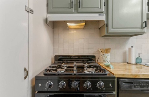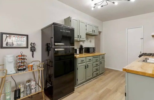 In the morning, we have you covered with a full coffee bar! Sip inside, or take to go. The kitchen is equipped with all the essentials for cooking. Brand new yet retro style appliances give this room a fresh look, while offering period vibes.