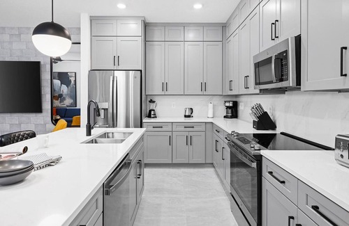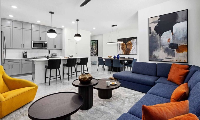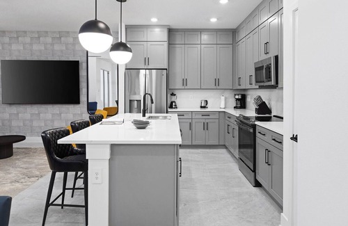 Urban sophistication meets cozy vibes in this super chic 4-bedroom gem on Orlando's International Drive–steps from the best theme parks, attractions, dining, and shopping this epic city has to offer. Set your bags down in one of three delicious king bedrooms, and send the littles off to enjoy the whimsical themed bedroom—where their imaginations will run as wild as the Universal Orlando coasters down the road. Start or end your day at your private pool ft. loungers, a patio table, and more.