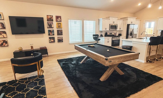 Welcome to The VIP Lounge – a bold gold and black-themed getaway with luxury touches throughout. Relax in the private outdoor sauna, enjoy sleek lounge spaces, and add premium services like wine packages or celebration décor. Located near Houston Premium Outlets, Katy Mills Mall, and major hospitals, this stylish stay offers comfort, convenience, and class—perfect for any occasion.