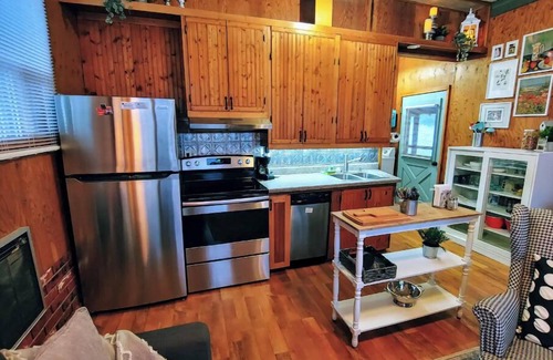 The washer/dryer is in the hallway and bathroom is at the end of the hall. Several upgrades have been made, while keeping the charm of old. There is a newer refrigerator, stove/oven, microwave, toaster, iron, etc.