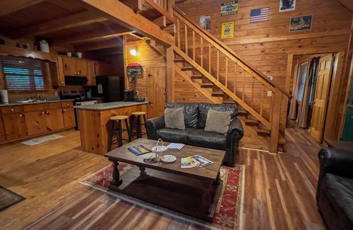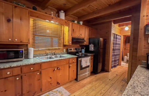 This beautiful log cabin, with gorgeous pine flooring is the star of the area with modern upgrades. Relax outside on the porch, in the jacuzzi, or around the fire pit with a glass of complementary wine. Pike's Peak has a fully stocked kitchen to prepare full meals for the family. This beautifully cabin is located in a picturesque setting, perfect for enjoying a quiet evening on the front porch, or grilling on the charcoal grill. Relax with the whole family at this peaceful place to stay.
