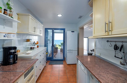 Fully equipped kitchen with refrigerator, freezer, microwave, oven, dishwasher, washing machine, dryer, coffee maker, kettle, and complete kitchen utensils.