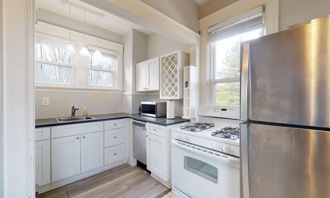 In the upstairs Vista Villa View 2, the living room offers cozy leather sofa seating and a smart TV. A second living space on the 3rd floor is a quiet retreat to enjoy your own entertainment in the form of a good book or a favorite movie. The kitchen is fully equipped for any of your mealtime endeavors and features ample counterspace and cabinetry for preparation and storage. Enjoy your fare together with a view of the neighborhood at the dining room table with seating for 4. The kitchen balcony is a tranquil spot to sip your fresh cup of morning coffee as you plan out the exciting day ahead.