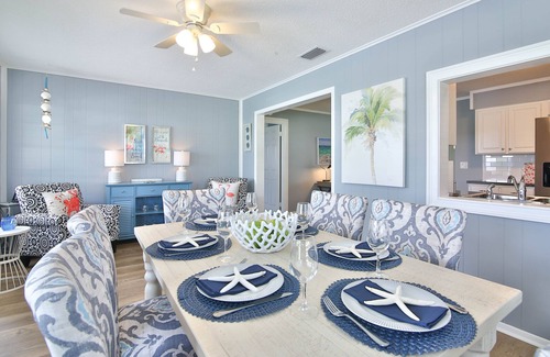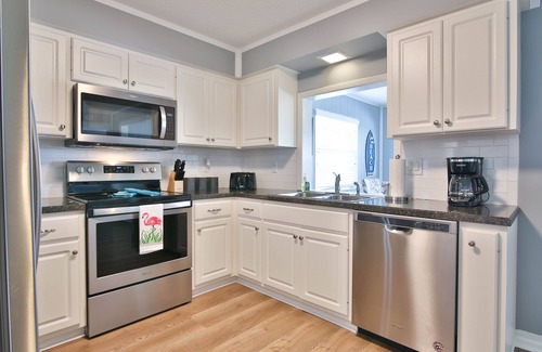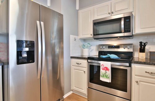 The living room has plenty of comfortable seating options and a large smart TV to watch your favorite shows and movies. The kitchen with stainless steel appliances is well equipped with everything you would need to prepare breakfast, lunch and dinner and the dining room comfortably seats 6 people. When the kids are playing outside and you are wanting to catch up on a book, the plush chairs in the dining room can make for a great reading corner and a small desk across the kitchen could be a makeshift work place.