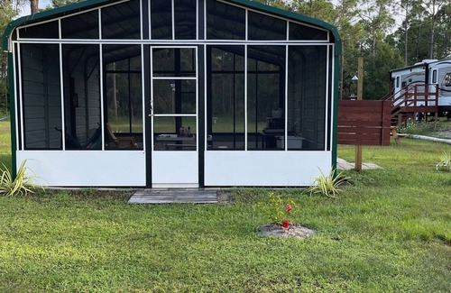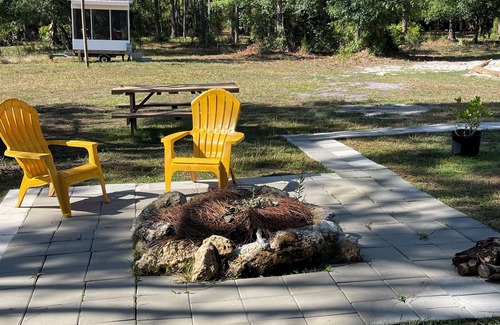 Welcome to Paradise Ranch, where you can escape the constant city lights and enjoy the starry sky around the fire pit. The RV is situated on five acres of private land, allowing you to explore the great outdoors of Florida during your stay. The ranch is just 30 minutes away from Lake Okeechobee. Additionally, if you are traveling with a trailer or a boat, there is ample parking space available.