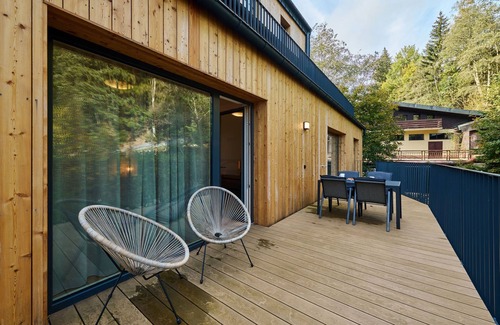 "Vogue Ridge Retreat & Terrace", 3-room apartment 74 m2, on the ground floor. Spacious and bright, very beautiful and modern furnishings: living/dining room with open-hearth fireplace, dining table and TV. Exit to the terrace. 1 room with 1 double bed, shower/WC and TV. Exit to the terrace. 1 room with 1 double bed and shower/WC. Kitchenette (oven, dishwasher, 4 induction hot plates, toaster, kettle, freezer, electric coffee machine). Heating. Large terrace 30 m2. Terrace furniture. Beautiful view of the countryside and the river. Facilities: Internet (WiFi, free). Parking (1 car). Please note: suitable for families. Non-smokers only.