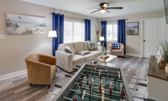 INDOOR LIVING: Smart TV, dining table w/ bench seating, foosball table, board games, updated interior, open floor plan