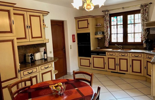 La cuisine avec son coin repas (4 personnes) est entièrement équipée. Un deuxième réfrigérateur - congélateur est également disponible dans la buanderie à côté de la cuisine où se trouve aussi une machine à laver. Le sèche-linge est en bas dans le garage.